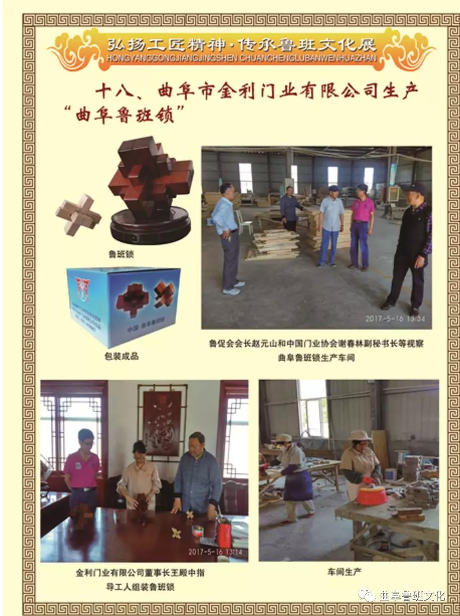 金利木门公司地处班门圣地,以挖掘和开发民间工艺品、弘扬工匠精神、传承鲁班文化为宗旨。在做好门业的同时,近年又开发了春秋战国时期鲁国著名匠师工圣鲁班发明的寓教于乐的健脑益智、老少皆宜的休闲智力玩具——鲁班锁。曲阜鲁促会理事王殿中董事长在曲阜鲁班文化研究促进会指导和监制下,在国家工商总局商标局注册了圣艺鸿商标,组织企业生产的曲阜鲁班锁,连续两年赠送中建协文化分会在曲阜举办的全国首届建筑业企业文化建设经验交流会和《中国建筑业协会年鉴》编委扩大会暨全国建筑史志成果研讨会与会人员,受到中建协、文化分会领导和全国班门传人的欢迎赞赏。这种鲁班锁,小巧玲珑,机关玄奥,与国务院总理李克强赠送德国总理默克尔的一模一样。此种鲁班锁模型在北京展览馆展出的“砥励奋进的五年”大型展览中亮相,被称为“神秘的礼物”,寓意深刻。鲁班故里鲁班锁,健脑益智难题破。曲阜鲁促会副会长兼秘书长刘玉明作为曲阜鲁班传说和鲁班锁技艺传承人带着曲阜“圣艺鸿”鲁班锁参加了2017年5月下旬山东省政协和省文化厅等单位组织的庆祝香港回归二十周年系列活动——山东非遗走进香港文化交流体验活动,在香港理工大学展示后受到中央政府驻港办领导和社会各界人士的广泛关注和赞赏。刘玉明把玩的第一代六根木的鲁班锁采用卯榫结构,不用任何辅助材料,能组装成六种不同的样式,看似简单的卯榫结构,绿色环保,奥妙无穷,体现正确答案不止一个,有益思维开发创新。新华社香港分社记者李鹏给予特写镜头给予报道,并说愿义务给予宣传推广。班门传人王殿中组织生产的圣艺鸿木门和鲁班锁已红遍神州大地,将随“一带一路”走出国门,象曲阜鲁班传说那样,远走高飞,造福人类。