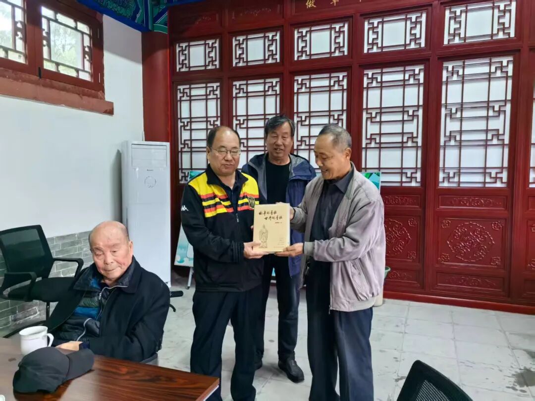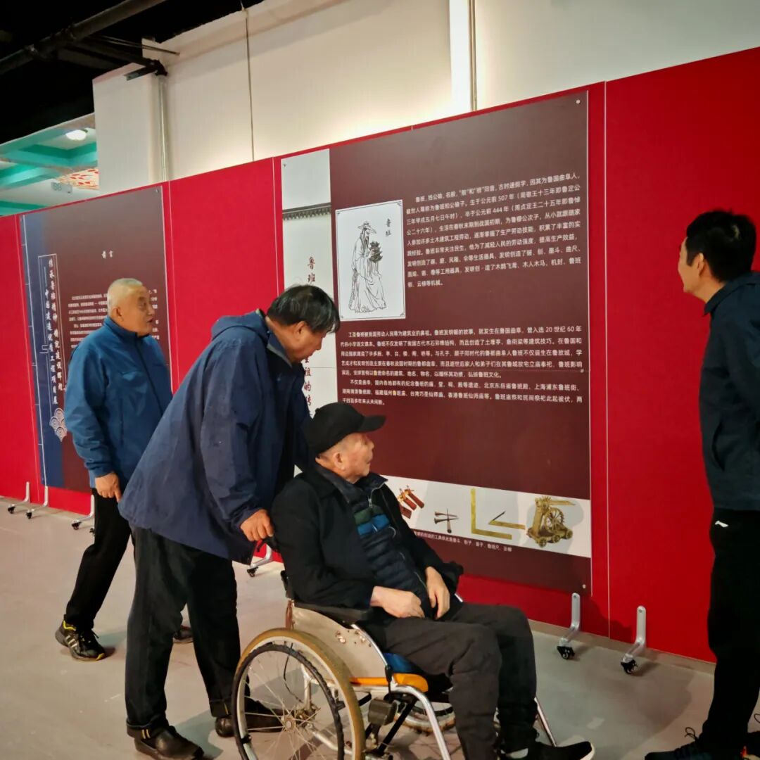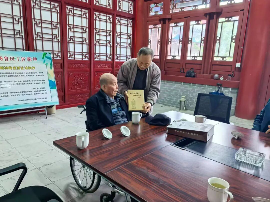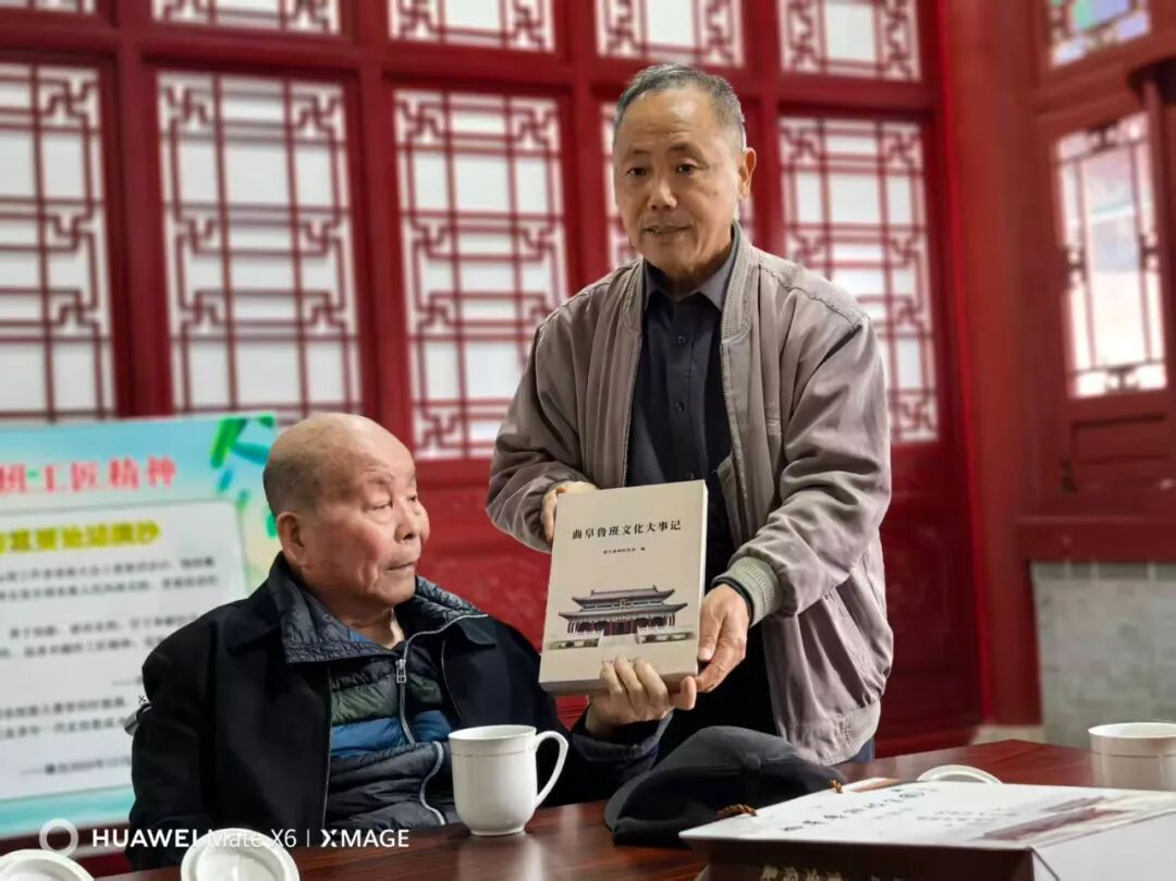 在鲁班博物馆一楼展厅,参观了班门圣地曲阜人鲁班史书铁证和中国建筑工程鲁班奖历届获奖工程图文并茂展览。在鲁班文化传承中心座谈时,班门传人先后向李瑞森、李连元父子和国伟同志赠送了全国人大代表、山大儒学高等研究院特聘教授、孔子研究院原院长、曲阜鲁班研究会会长杨朝明主编的由罗哲文大师爱子、中国文联民间文艺家协会原书记罗杨挥毫题写书名的《曲阜的鲁班·世界的鲁班》和市政府原主席、曲阜鲁班研究会首任会长赵元山和班门传人刘玉明主编的《曲阜鲁班文化大事记》。受到大家欢迎,并合影留念。一致认为:曲阜鲁班研究会会同国家省市有关单位以史为鉴、守正创新,联合成功举办了二十届中国曲阜鲁班文化节,实现了国家级非遗“鲁班传说”和鲁班技艺文化遗产的系统性保护、活态性传承,功德无量!
