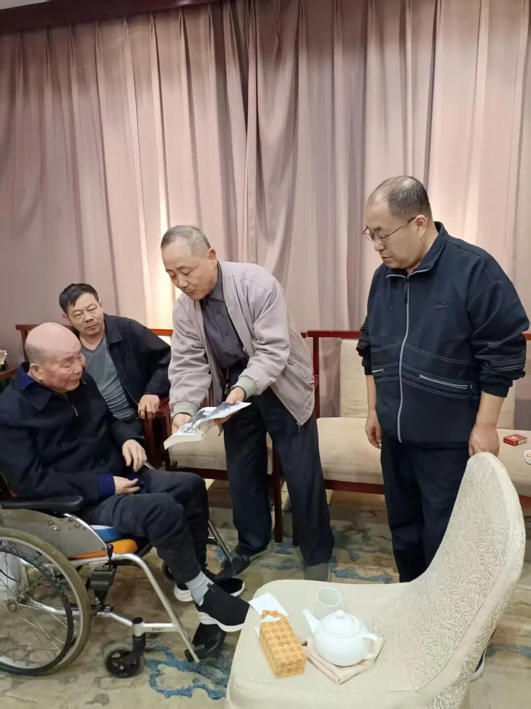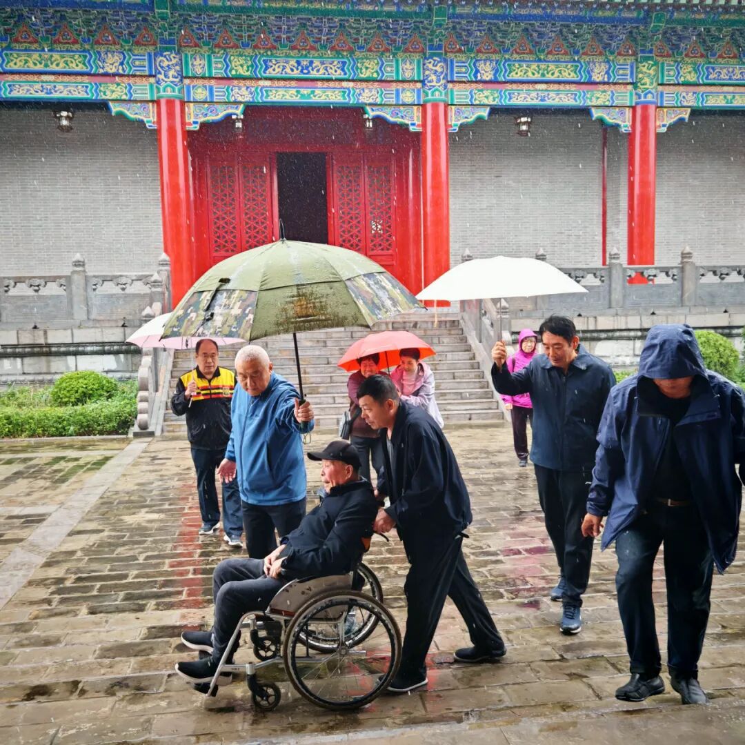 享年90岁高龄半身不遂的李总,乘座轮椅在家人、护师帮助下来到其长兄全国政协原主席李瑞环题写匾额的“鲁班殿”,立刻让家人搀扶站立,向祖师鲁班圣像行三鞠躬礼。此时罗哲文大师的关门弟子、曲阜鲁班研究会副会长兼法人代表、曲阜园林古建工程公司董事长王树宝冒雨赶到,与好久未见面的大师兄亲切握手问候交谈,在“司仪”颜文帮助李总和班门传人为鲁班祖师上香后,宾主集体在“敕封北城侯鲁公输子”神位前三鞠躬。身残志坚、尊师敬贤精神十分感人的李总又和大家一起向祖师鲁班行礼。