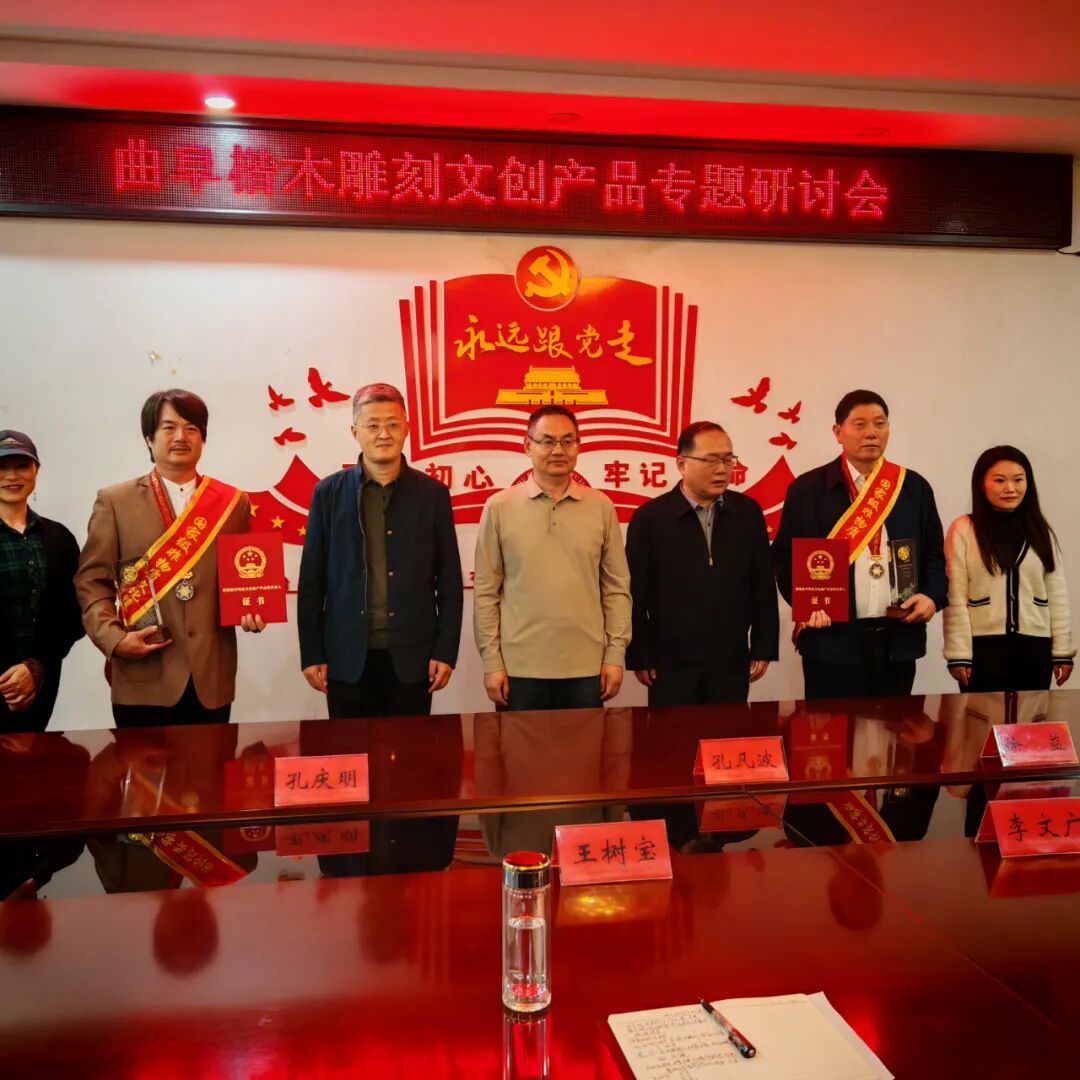 10月17日下午,曲阜市文化和旅游局在会议室举行第六批国家级非物质文化遗产代表性传承人授牌仪式,国家级非遗代表性传承人彭文瑜(孔府菜烹饪技艺)、王树宝(琉璃瓦制作技艺)、李文广(祭孔大典);山东省级非遗代表性传承人刘玉明(国家级非遗代表性项目鲁班传说)、孔繁彪、颜德印、褚德胜(国家级非遗代表性项目楷木雕刻),丁辉(尼山砚制作技艺)、周龙涛(碑拓技艺)、徐明坤(弓箭制作技艺)、葛朋(孔府菜烹饪技艺)、马强(孔府家酒蒸馏技艺)、郑友明(桑皮纸制作技艺)和市文旅局、市公共文化服务中心、市文化馆负责人等出席揭牌仪式。