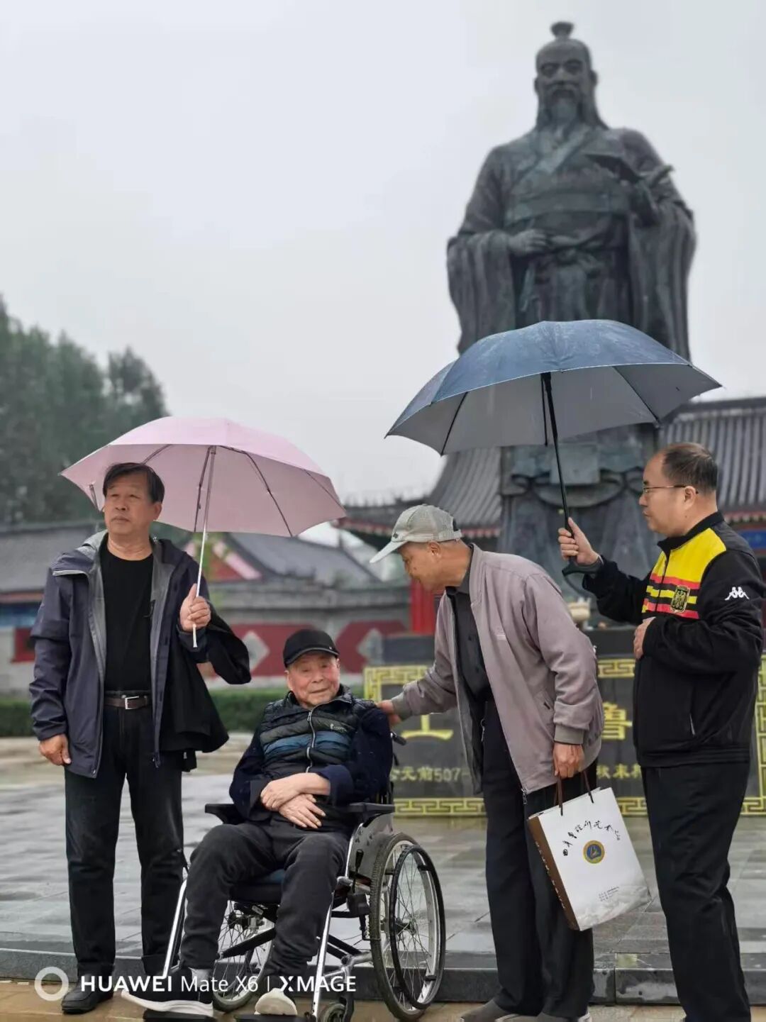 宾主打伞冒雨在中国两院院士、清华大学教授吴良镛先生挥毫题名的“曲阜鲁班故里园”大门前认真观赏工圣鲁班铜像和“曲阜鲁班故里园”大师墨宝及孔子75代孙孔祥胜书丹的“哲匠始祖神州百工敬,大成智慧世界万代传”春联和中国书协会员、曲阜市书协主席韩益书丹的“东鲁绳规远垂万世兴华夏,北城俎豆永荐千秋耀班门”楹联和国家级非遗“鲁班传说”传承示范点和山东城建职业学院大学生鲁班文化育人基地、济宁市科普教育基地等匾牌。