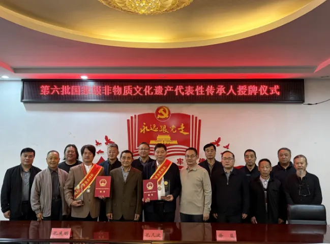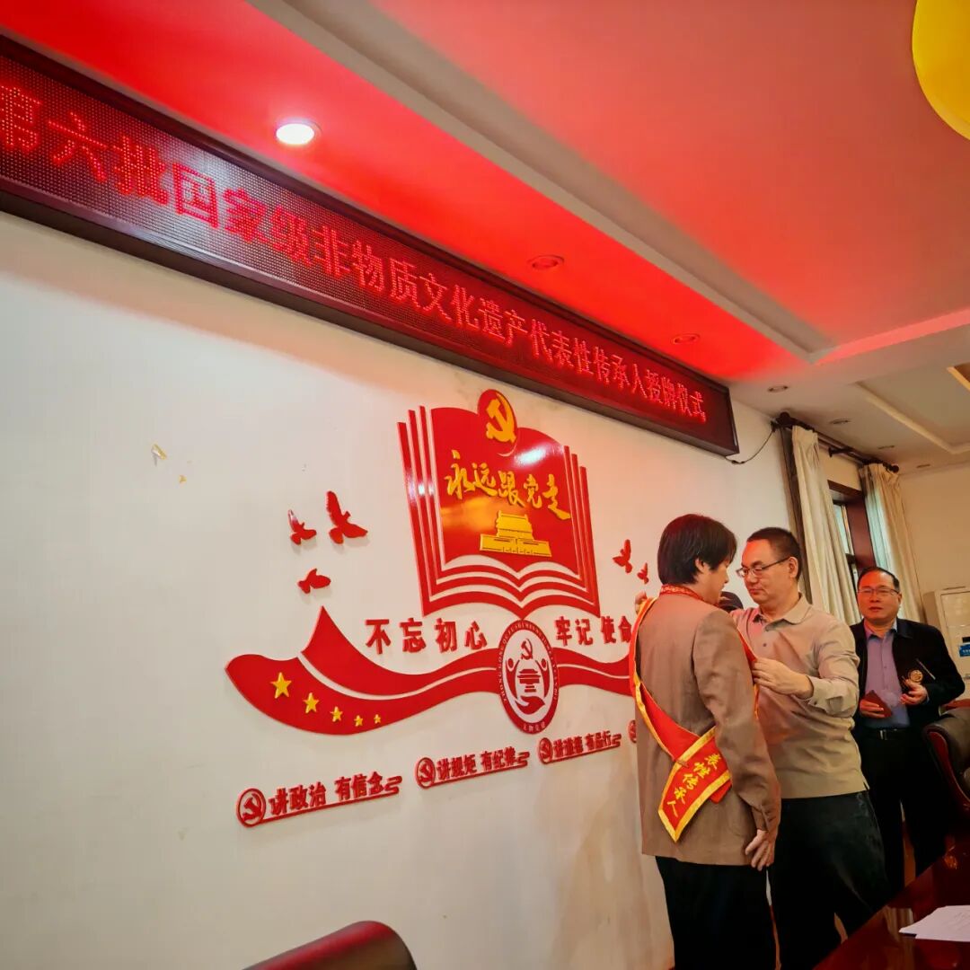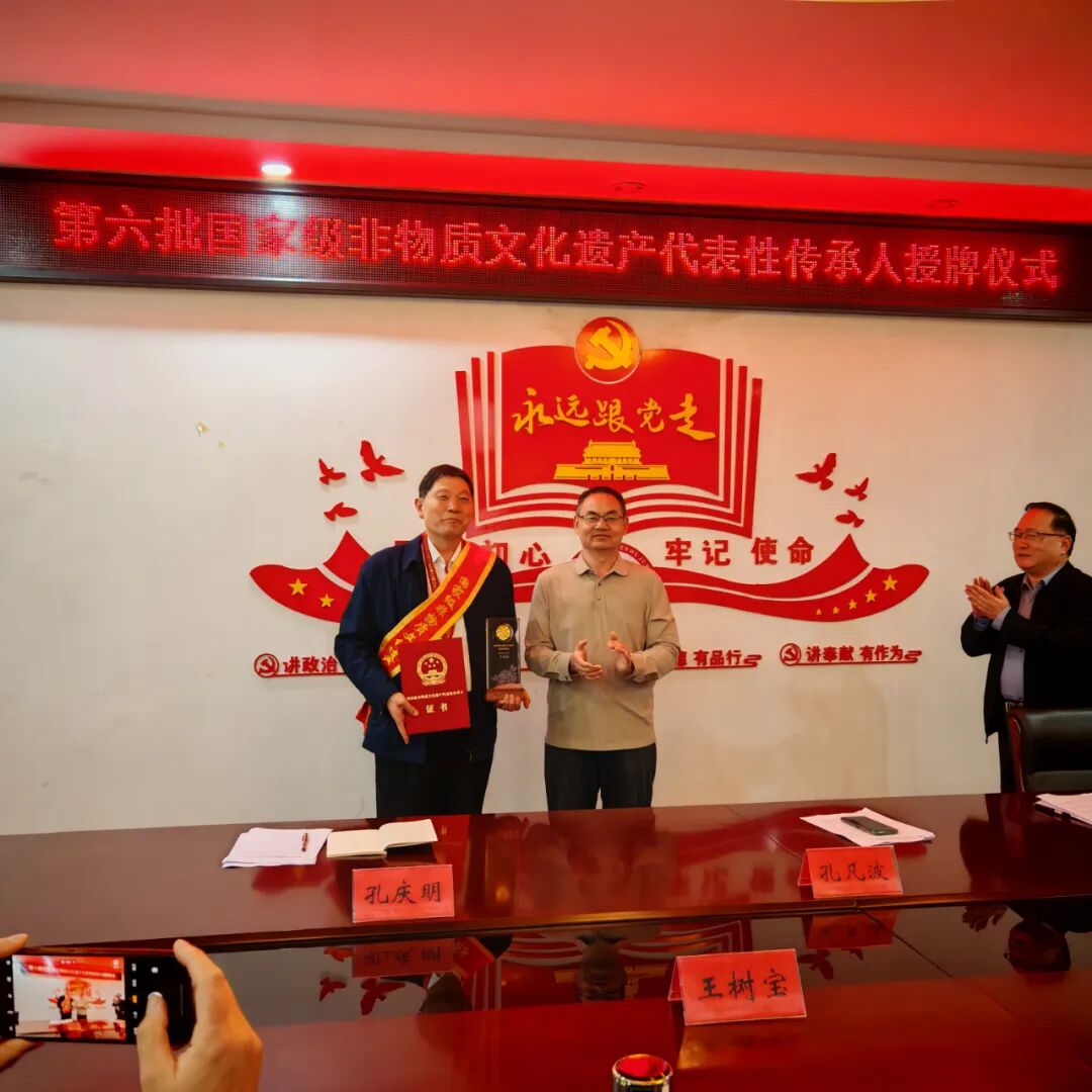 在曲阜市文旅局党组成员、市公共文化服务中心主任徐益主持下,首先由市公共文化服务中心副主任、市文化馆长孔庆明宣读《文化和旅游部关于公布第六批国家级非物质文化遗产代表性传承人的通知》,曲阜市王树宝荣获国家级非遗项目“琉璃瓦制作技艺”国家级代表性传承人,李文广荣获国家级非遗代表性项目“祭孔大典”国家级代表性传承人。其次曲阜市文旅局党组书记、局长孔凡波为王树宝、李文广两位新晋国家级非遗代表性传承人佩戴胸章、绶带、颁发证书并讲话,代表市文旅局向两位新晋国家级非遗代表性传承人王树宝、李文广表示热烈祝贺!同时对传承人提出要发挥好榜样作用、做好传帮带,让更多年轻人接续薪火,共同守护好传承好东方圣城曲阜功在当代、利在千秋的国家、省市非遗要求,希望各位传承人在文旅融合发展、乡村振兴、经济增长和百姓致富等方面做出新贡献!