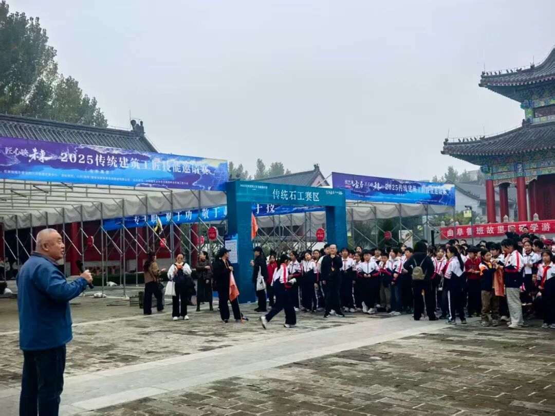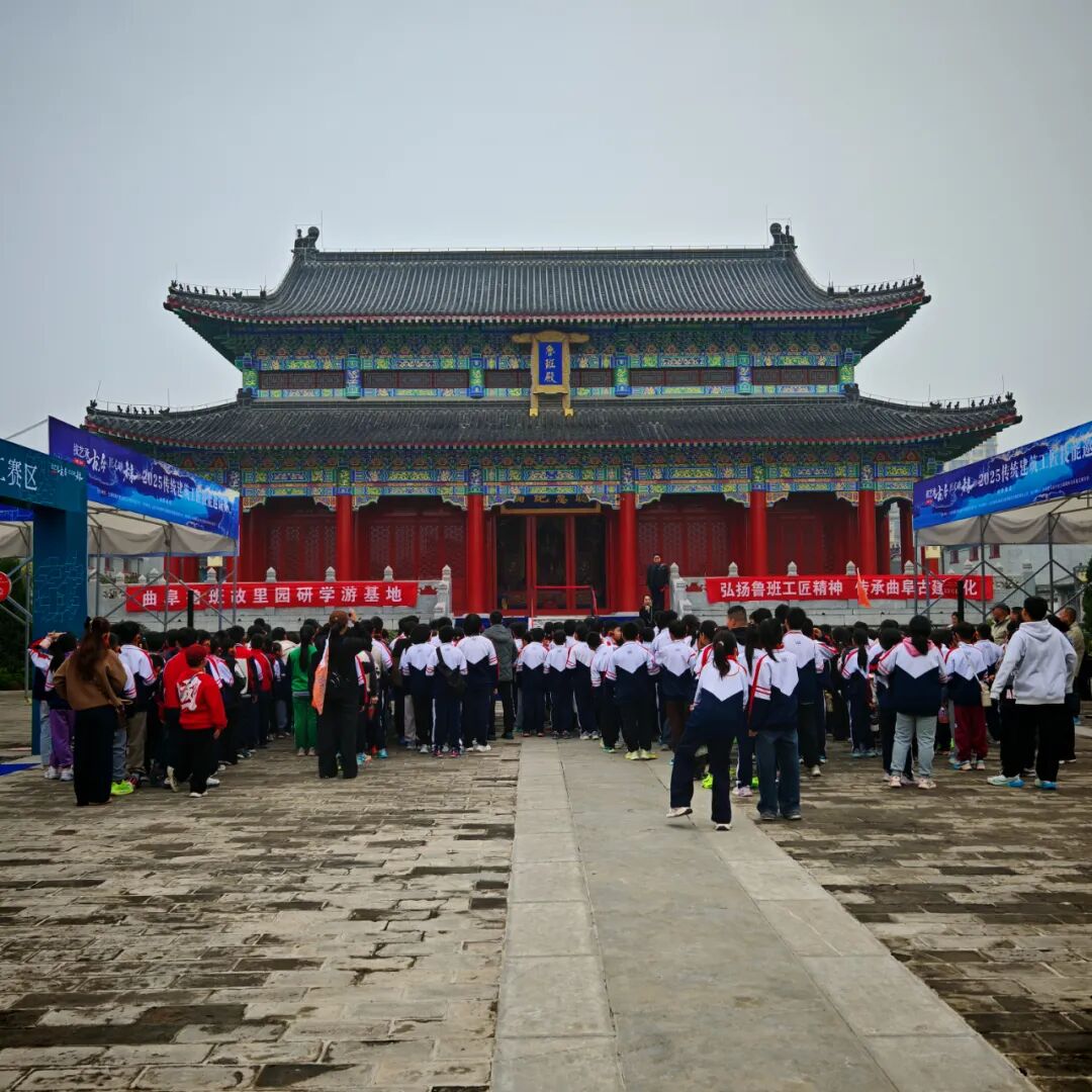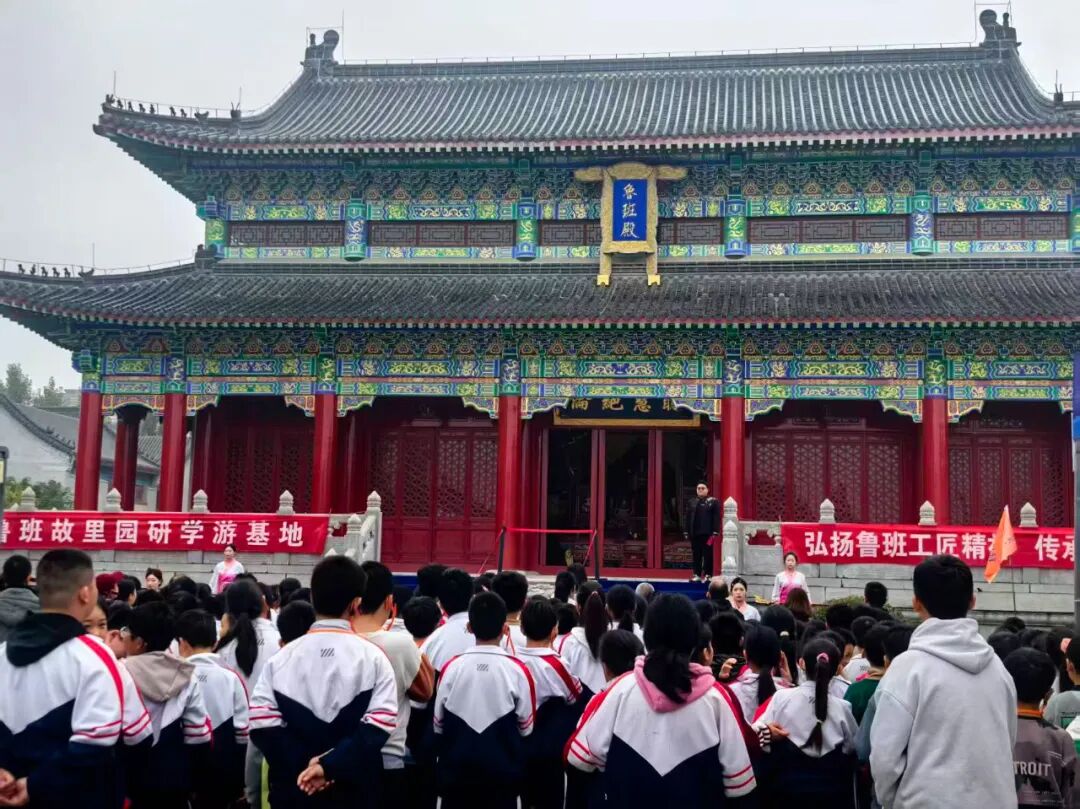 然后师生们在鲁班殿瞻仰鲁班圣像,参观鲁班圣迹图、24孝图壁画和规矩常新、百工师表 、群工宗仰、师表长尊、聪慧绝伦等匾额。在鲁班博物馆参观班门圣地曲阜人鲁班史书铁证和国家建设工程最高奖鲁班奖获奖工程项目图文并茂展览。在鲁班工坊参观体验鲁班技艺木构古建固定结合器斗拱等。最后在鲁班殿大院欣赏历届中国曲阜鲁班文化节古建技能大赛获奖作品,听取曲阜古建文化商会党支部书记颜文等专家讲解。学生们走进班门圣地曲阜家门口的国家级非遗“鲁班传说”传承示范点“曲阜鲁班故里园”进行研学游非遗体验,深化了非遗进校园、进课堂、进教材、进头脑,使鲁班传说、曲阜楷雕、硫璃瓦制作技艺等国家级非遗活态传承后继有人。