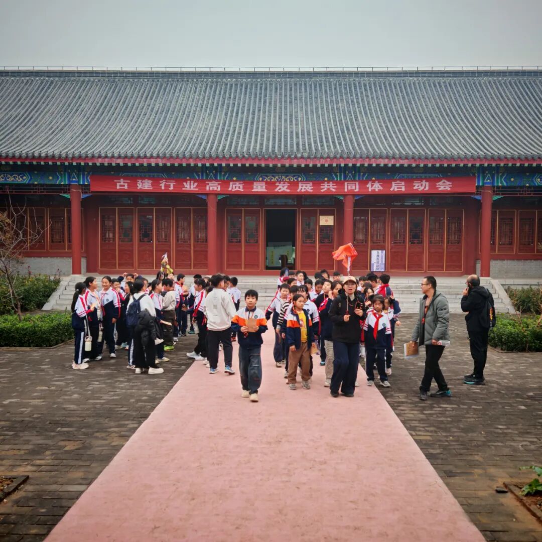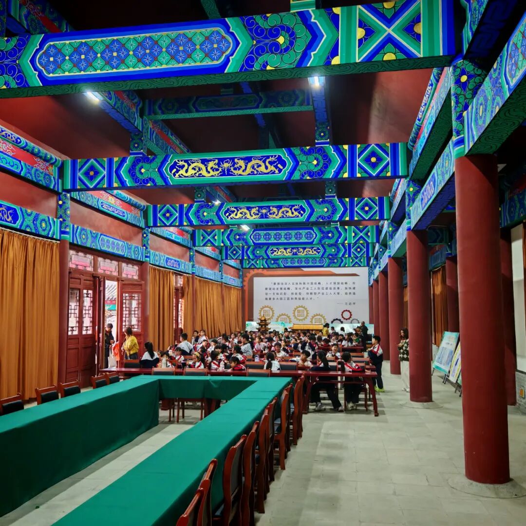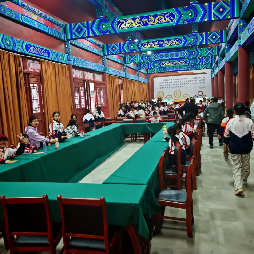 然后师生们在鲁班殿瞻仰鲁班圣像,参观鲁班圣迹图、24孝图壁画和规矩常新、百工师表 、群工宗仰、师表长尊、聪慧绝伦等匾额。在鲁班博物馆参观班门圣地曲阜人鲁班史书铁证和国家建设工程最高奖鲁班奖获奖工程项目图文并茂展览。在鲁班工坊参观体验鲁班技艺木构古建固定结合器斗拱等。最后在鲁班殿大院欣赏历届中国曲阜鲁班文化节古建技能大赛获奖作品,听取曲阜古建文化商会党支部书记颜文等专家讲解。学生们走进班门圣地曲阜家门口的国家级非遗“鲁班传说”传承示范点“曲阜鲁班故里园”进行研学游非遗体验,深化了非遗进校园、进课堂、进教材、进头脑,使鲁班传说、曲阜楷雕、硫璃瓦制作技艺等国家级非遗活态传承后继有人。