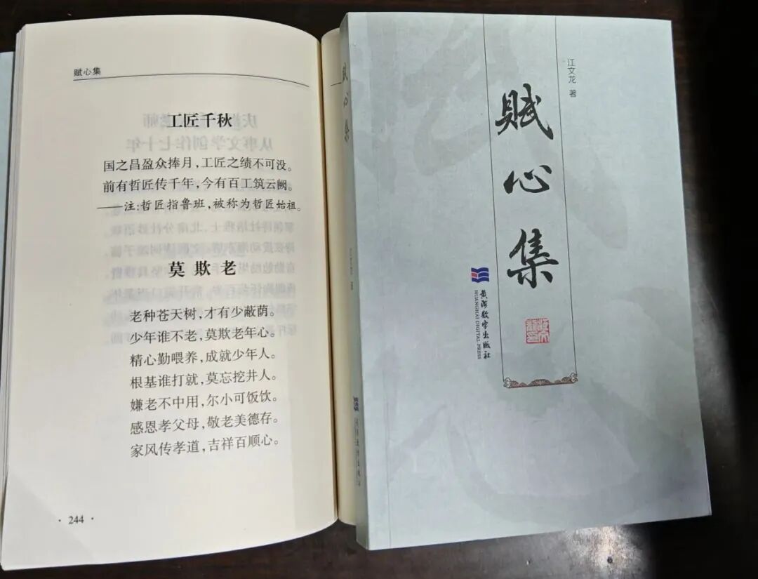 生活在东方圣城、孔子鲁班故里曲阜南关的江文龙,对中国优秀传统文化情由独钟,曾拜中国书协会员、曲阜市政协原副主席蒋开征先生学书法,书写、吟诵经典诗词成了每天的必修课,自然地走上了古体诗词的创作之路,中学时的理想是搞文学艺术。毕业后曾在大队试验田喂猪看牛,还干了三年木工、十年建筑、十二年批发商城、十四年南关居委党总支书记。在2019年曲阜作家协会换届时被推选为曲阜市作家协会主席,圆了学生时代的文学梦。勤于学习、观察、思考、动笔和热心为人民服务身兼数职的江文龙,不负众望,不仅在南关居委功成名就,光荣退休,而且还经常组织作协会员开展丰富多彩的文学创作活动,个人笔耕不辍,结出丰硕成果。在前几年创作出版《随心集》后,去年10月又由黄河数字出版社出版了《赋心集》。该书汇集了江文龙主席近年来创作的四百余首诗歌作品,内容丰富、题材多样,语句精练、情景交融,而且有的富有哲理。