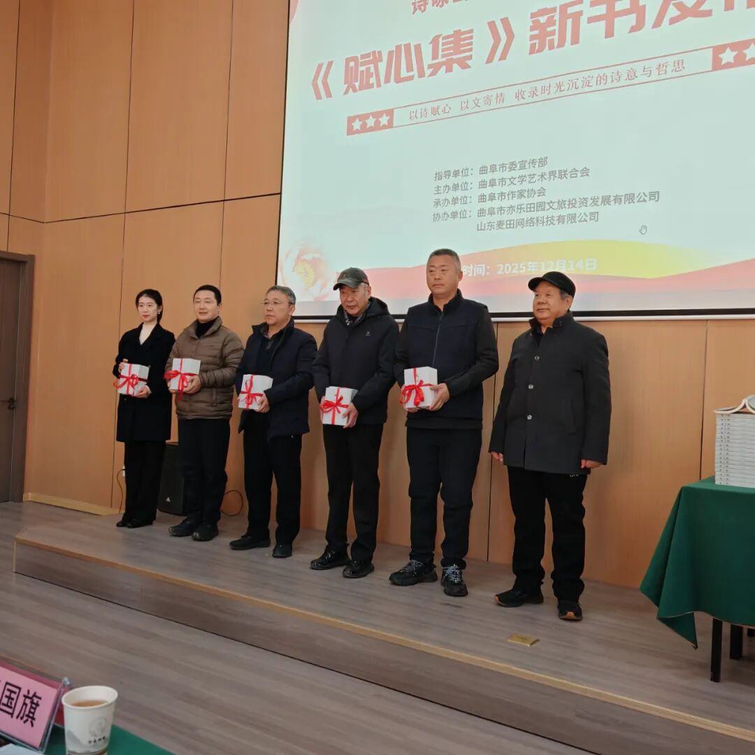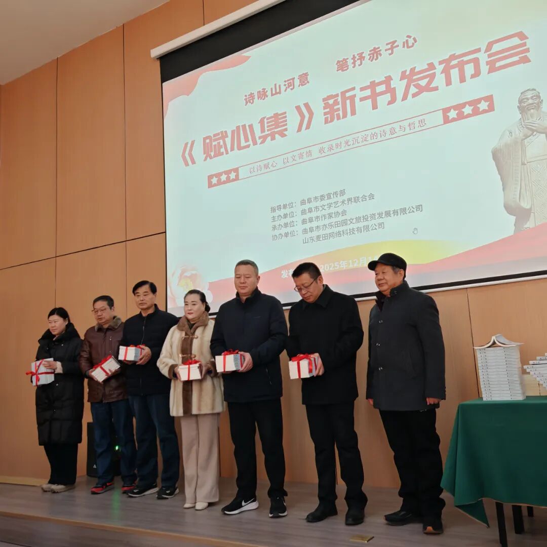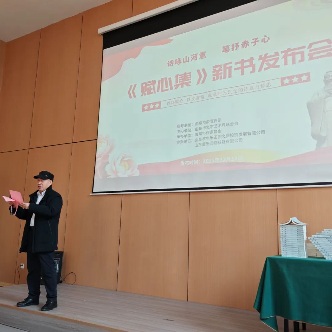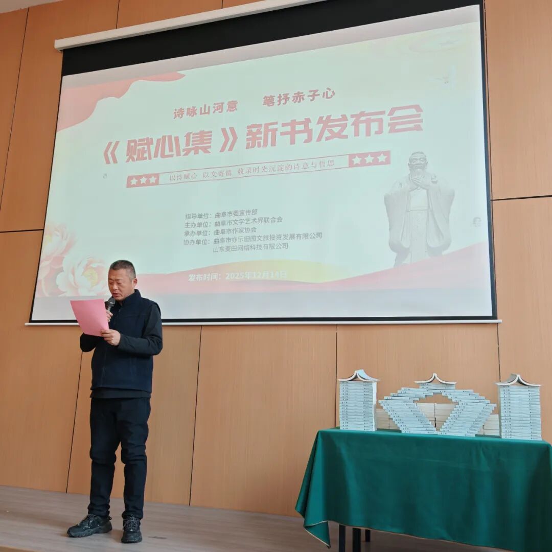 2025年12月14日上午,由曲阜市作家协会主席江文龙创作的诗集《赋心集》新书发布会在曲阜亦乐田园多功能厅举行。曲阜市文联党组书记、主席张国旗,曲阜市退役军人事务局副局长蔡运松,济宁市作家协会副主席纪广洋,曲阜市档案馆副馆长米志国,曲阜市图书馆副馆长马亮,曲阜市文化馆办公室主任贾振兴,曲阜鲁班研究会荣誉会长、党支部书记刘玉明,小雪街道阮家村党支部书记、亦乐田园文旅投资有限公司董事长孔德广,山东麦田网络科技有限公司董事长董安宁,曲阜孔家印务有限公司董事长孔建平,市作家协会主席江文龙等出席活动,曲阜市书协、美协、摄协、音协、戏协、曲阜印社、曲阜诗词学会、亦乐田园等单位负责人,曲阜市作协班子成员和部分会员,市融媒中心记者,部分诗词爱好者等50余人参加了活动。