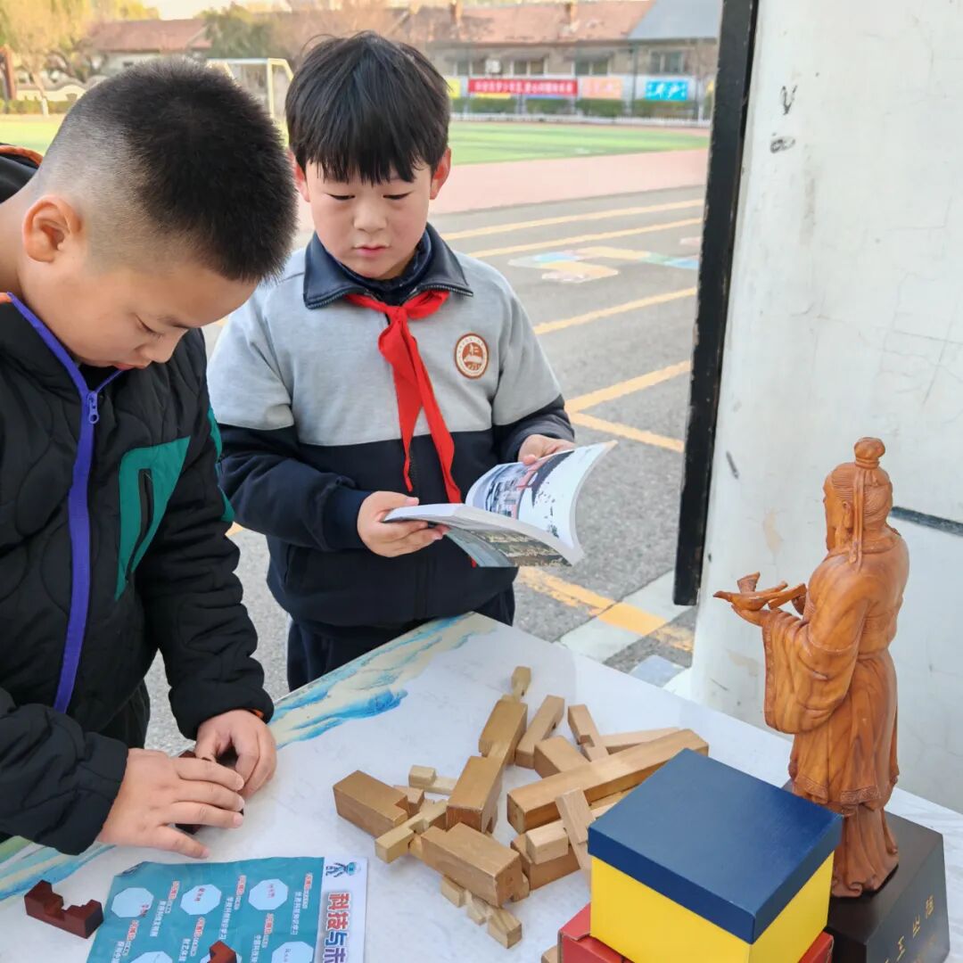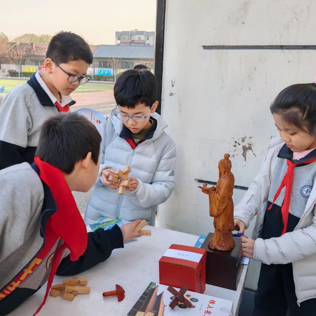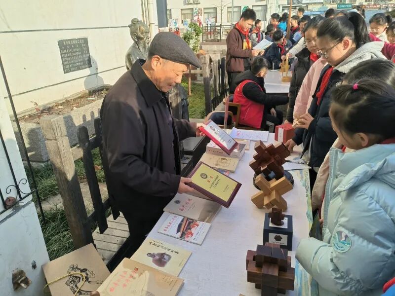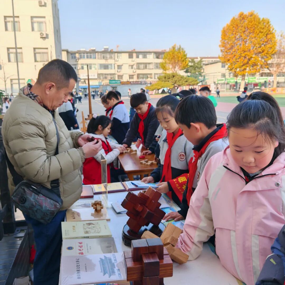 年逾七旬的传承人老当益壮,不仅上午参加开幕式和展示体验活动,下午2点半也又来到二附小大操场展位,为师生们继续讲解鲁班锁发明、鲁班锁原理和拆解组装技巧。传承人不仅展示了滨盛堂鲁班锁、圣艺鸿鲁班锁、山东鲁班文化发展集团班门造物鲁班锁,还展示了国家级非遗曲阜楷雕省级代表性传承人孔繁彪创作的鲁班楷雕像。师生们在鲁班传说鲁班锁展位留恋忘返,体验动手动脑、富教于乐健脑益智的曲阜鲁班锁折解组装技艺。